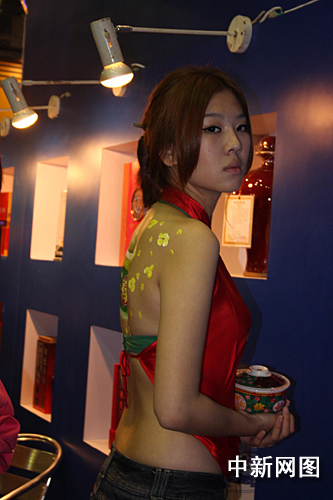 2009年秋季全国糖酒商品交易会11日上午在郑州开幕。在本届糖酒会展会上,一酒厂为吸引客商,把该厂的盛酒用的陶罐当场绘在了美女模特的裸背上。