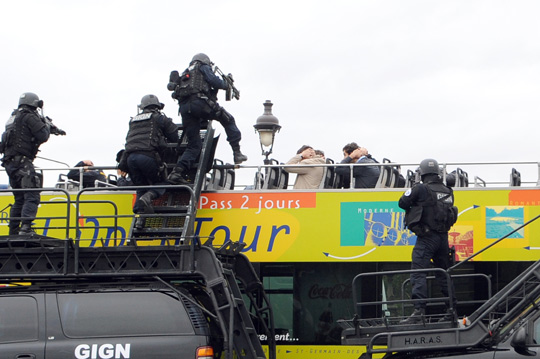 当地时间10月11日,法国巴黎,在2009年“公共安全日”活动中,法国国家宪兵特勤队举行了反恐怖主义袭击和劫持人质救援演习。