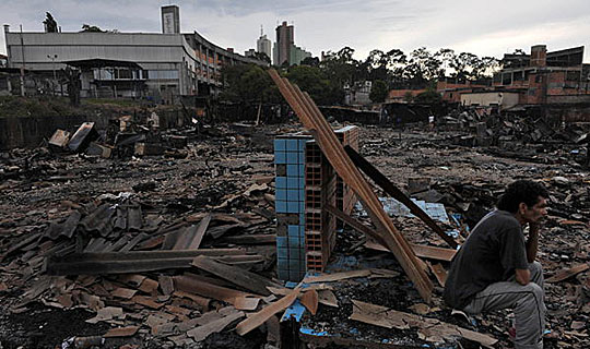 在巴西圣保罗西部的迪奥古皮里斯,一男子坐在被大火烧毁的房屋废墟上。
