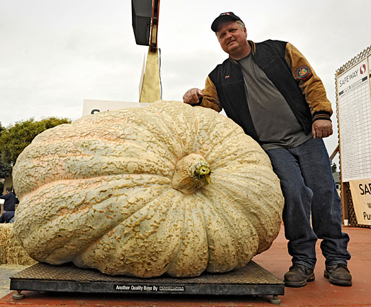 图为农场主Don Young与破世界纪录的南瓜合影。
