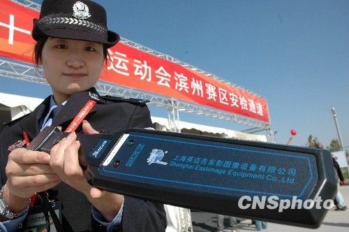 10月13日,山东滨州特警出动防暴车,设置安检门、通道式X光机,手持式金属探测仪对所有进场人员进行安检,严禁可疑人员和易燃、易爆、管制刀具等违禁物品进入。当日,第十一届全运会武术套路比赛在滨州进行。中新社发 梁宝海 摄