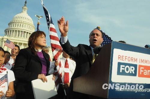 图为国会西班牙裔委员会移民任务小组主席古特瑞兹(Luis V. Gutierrez)在集会时发表讲话,重申移民改革基本原则,力促奥巴马推动综合移民改革。中新社发 吴庆才 摄