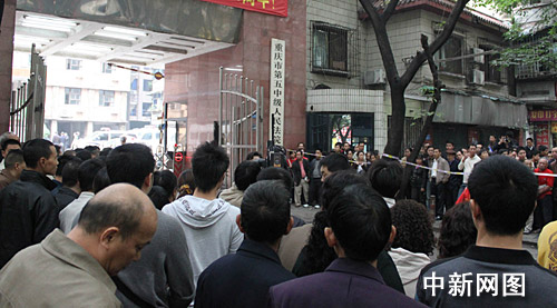 14日,法院外聚集着近百名不能进入参与旁听的群众。 郭虹 摄