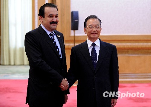 10月15日,中国国务院总理温家宝在北京人民大会堂会见了哈萨克斯坦总理马西莫夫。中新社发 廖攀 摄