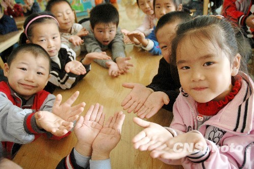10月15日是“国际洗手日”,为减少手部细菌预防甲型H1N1流感,江苏省睢宁县机关幼儿园开展“正确学洗手、预防甲流感”活动,组织老师教育孩子要学会标准洗手方法。中新社发 洪星 摄
