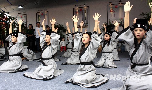 10月15日,2009年湖北宜昌秋季房地产交易会开幕,一家房地产公司还请来小学生现场进行国学表演,吟唱“三字经”,为房交会增添文化气息。中新社发 任卫红 摄