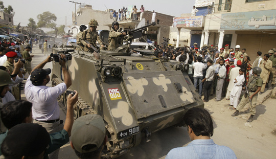 10月15日,巴基斯坦发生四起袭击警察机构事件。据法新社援引巴基斯坦官方数字报道,在连环袭击中,已有39人死亡。塔利班已宣布对此系列事件负责。 图为巴基斯坦军方进入遭受袭击的东部城市拉合尔的一所警察学校,恢复对该地区的控制。