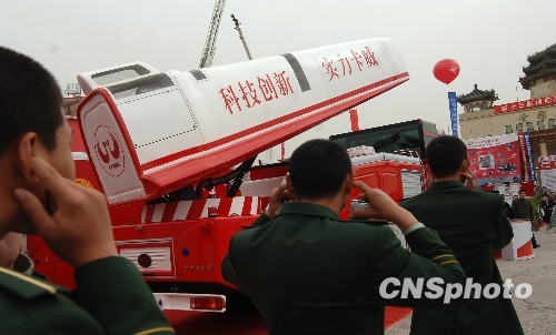 10月16日,淘汰空军国产航空涡轮喷气发动机改装的高气压风力消防车在北京农展馆举办的第十三届国际消防设备技术交流展览会展出,并试车开机震耳欲聋,令前来参观的好奇的消防武警兵士急忙掩耳。中新社发 邹宪 摄