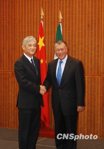 新当选澳门第四届立法会主席的刘焯华(左)十月十六日下午在澳门文化中心宣誓就职,由澳门特区行政长官何厚铧(右)监誓。宣誓仪式结束后,何厚铧向刘焯华握手祝贺。中新社发 毕永光 摄
