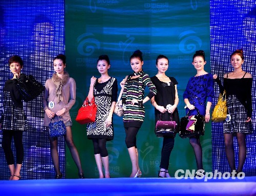 10月16日,全国广告模特大赛在河北省白沟举行,白沟箱包是模特儿的随身道具。中新社发 宋吉河 摄