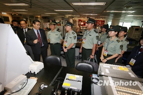 十月十六日,解放军驻港部队副政委曾庆年少将(左四)一行八十多人,到访香港城市大学与师生开展交流联谊活动。这是官兵们参观“城大”无线电通讯研究中心与毫米波国家重点实验室。中新社发 郑祚声 摄