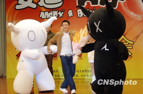 10月16日,刘德华现身北京为时下当红的“儿子”安逗、黑仔进军电视圈助阵。他于2007年设计创作的这两个卡通形象,将主演百集人偶喜剧《安逗与黑仔》,预计2010年播出。该剧是国内首部百集大型时尚魔幻喜剧。剧中,安逗和黑仔不再“裸身”出境,将有大量造型独特的服装,会与张含韵扮演的角色,有感情对手戏。 图为刘德华与两个“儿子”亲密无间。荣升为“星妈”的刘德华坦言,暂时没有与这两个“儿子”同台演出的计划。中新社发 李学仕 摄