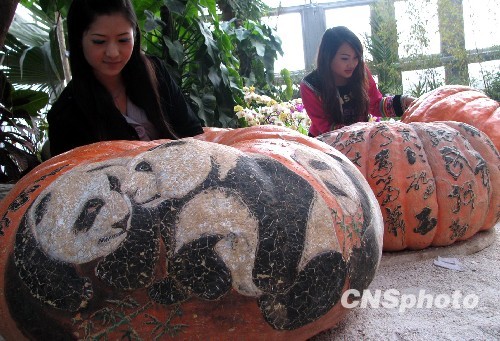 10月16日,在北京植物园热带展览温室参观的游客被展示的巨型大南瓜吸引,此次植物园展出的巨型南瓜中最大的重达300多斤,直径1米多,并且刚刚参加了中国第七届花卉博览会的展览。中新社发 钱兴强 摄