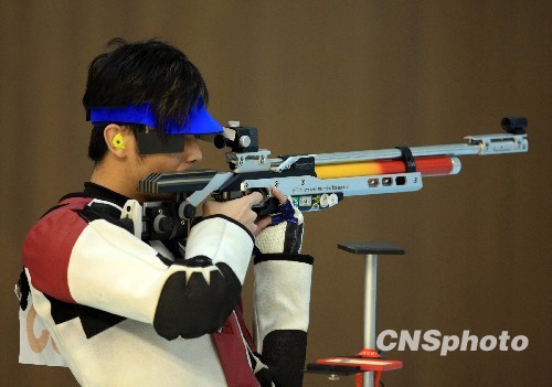 10月17日,在山东济南进行的第11届全运会男子10米气步枪决赛中,名将朱启南以702.2环的总成绩获得冠军。中新社发 汤彦俊 摄