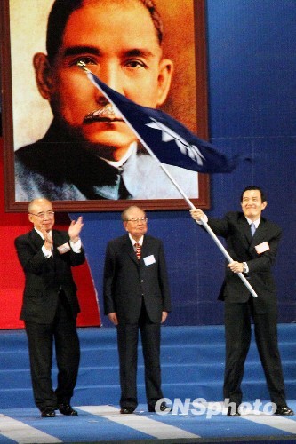 中国国民党10月17日召开第十八次全党代表大会,马英九正式接任中国国民党党主席。图为新任党主席马英九接过党旗挥舞。中新社发 黄少华 摄