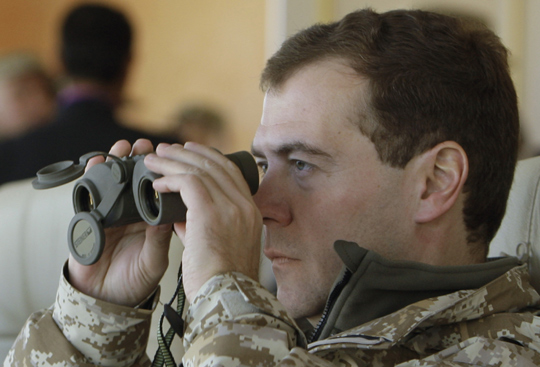 俄罗斯总统梅德韦杰夫到现场观摩演习。