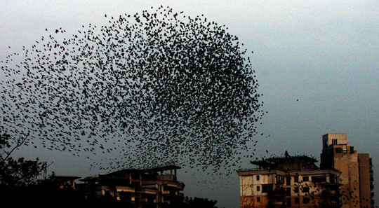 10月16日傍晚,近万只椋鸟在湖北省武汉动物园树林上空及旁边居民小区旁飞翔,叽叽喳喳,热闹非凡,场面蔚为壮观。