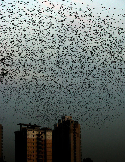 10月16日傍晚,近万只椋鸟在湖北省武汉动物园树林上空及旁边居民小区旁飞翔。金思柳/CFP