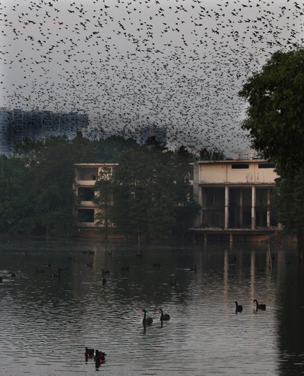 10月16日傍晚,近万只椋鸟在湖北省武汉动物园树林上空及旁边居民小区旁飞翔。金思柳/CFP