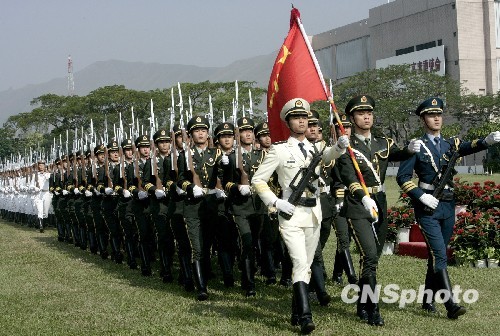图为驻港部队仪仗队举行了庄严肃穆的升旗仪式。中新社发 张勤 摄