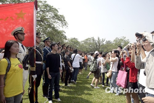 图为学生与驻港部队三军仪仗队合影留念。中新社发 张勤 摄