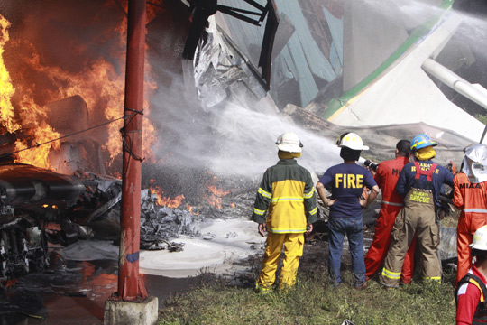 10月17日,在菲律宾首都马尼拉南部的拉斯皮尼亚斯,一架DC-3飞机在居民区坠毁,造成飞机上4人死亡。图为消防人员在扑灭燃烧的DC-3飞机残骸。