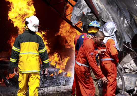 图为消防人员在扑灭燃烧的DC-3飞机残骸。