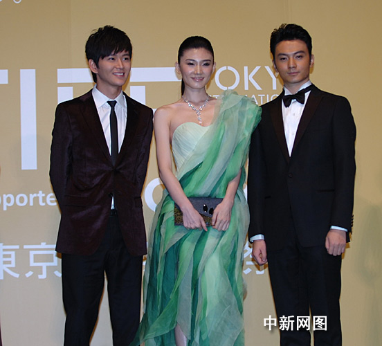 另一部参赛的中国电影《天长地久》主要演员刘冬(中)、黄明(左)等在开幕式上。中新社记者 朱沿华 摄