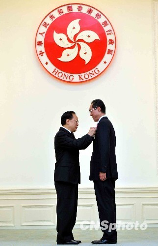 十月十七日,香港特区政府在礼宾府举行授勋仪式,四百多人获得嘉许,表扬他们对社会的贡献。特首曾荫权向唐英年颁发大紫荆勋章。中新社发 港欣 摄