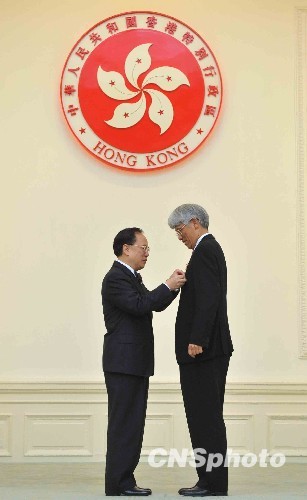 十月十七日,香港特区政府在礼宾府举行授勋仪式,四百多人获得嘉许,表扬他们对社会的贡献。特首曾荫权向任志刚颁发大紫荆勋章。中新社发 港欣 摄