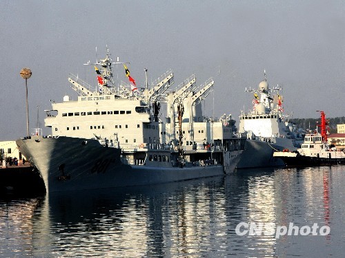 10月18日上午,北海舰队在青岛某军港码头举行仪式,欢送由海军“石家庄”号导弹驱逐舰和“洪泽湖”号远洋综合补给舰组成的海军舰艇编队,启航出访智利瓦尔帕莱索、秘鲁卡亚、厄瓜多尔瓜亚基尔和法属波利尼西亚帕皮提。中新社发 鄢润波 摄