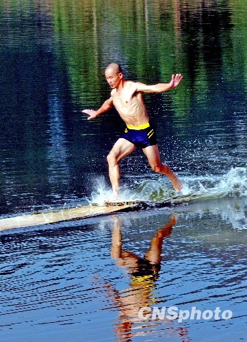 借助薄薄的三合板,释理亮运用修炼的水上轻功成功“飞”出15米远,打破了他之前创下的10米纪录。中新社发 傅丹丹 摄