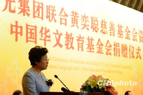 国务院侨务办公室主任李海峰出席在北京钓鱼台国宾馆举行的“金光集团联合黄奕聪慈善基金会资助中国华文教育基金会捐赠仪式”并致辞,称赞印度尼西亚华侨黄志源为华文教育捐资一亿元人民币的善举。中新社发 侯宇 摄