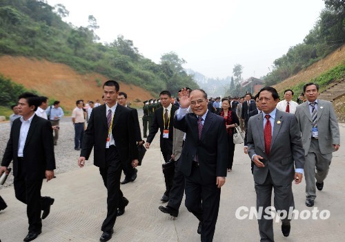 10月19日,越南常务副总理阮生雄(前排右二)在中国—东盟自由贸易区即将建成的关键时刻,以一种特别的方式体验中国与东盟陆路交通的对接——他自友谊关进入中国,出席将于20日开幕的第六届中国—东盟博览会。中新社发 蒋雪林 摄