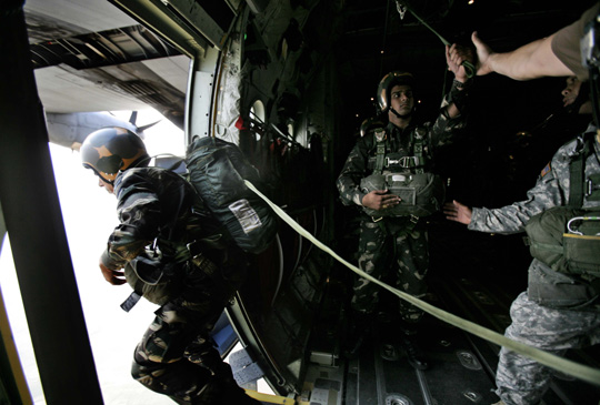 10月19日,美国和印度两国空军在印度北方邦国际宇航联合会的基地举行了一次空中联合军事演习。图为双方进行联合的跳伞演练。