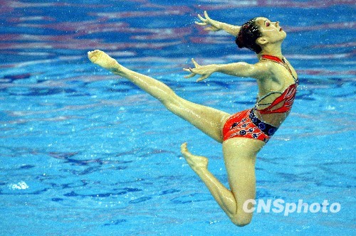 10月18日,第十一届全运会花样游泳自由组合比赛在青岛赛区举行,图为天津姑娘在比赛中。中新社发 张宇 摄