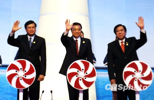 第六届中国—东盟博览会在广西南宁市开幕。中国国务院副总理李克强、老挝总理波松、菲律宾众议长诺格拉雷斯、越南常务副总理阮生雄等中国和东盟的政要为博览会开幕式剪彩。中新社发 蒋雪林 摄