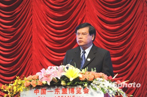 图为老挝总理波松在开幕式上致辞。中新社发 蒋雪林 摄
