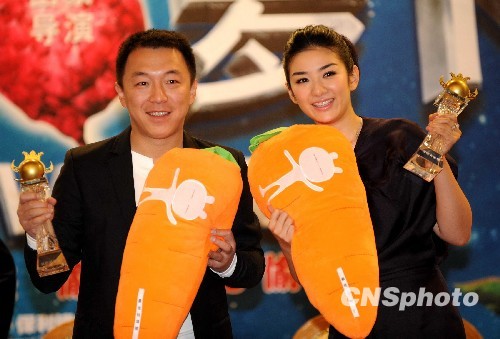 10月19日,由文隽监制,田蒙执导的电影《倔强萝卜》北京举行首映新闻发布会。主演黄渤与黄奕到场,两人还获赠“萝卜”奖杯。中新社发 曹继 摄