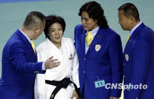 10月20日,第十一届全运会女子48公斤级柔道比赛在山东滨州举行,来自四川的龚华负于山东徐春燕,获得亚军。图为龚华在比赛结束后不离赛场,与裁判交涉十几分钟,比赛被迫中断。这是当日柔道比赛中,第二位选手心存疑议而不离赛场。中新社发 张宇 摄