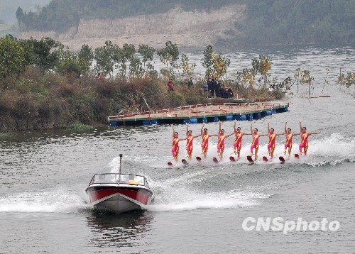国家特级滑水队队员表演的多人叠罗汉、双人飞板、6人绕船360、滑板水上芭蕾等赢得人们喝彩。中新社发 张枥 摄