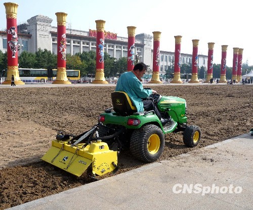 图为北京天安门广场上工人驾驶车辆加紧翻耕土地。中新社发 玉龙 摄