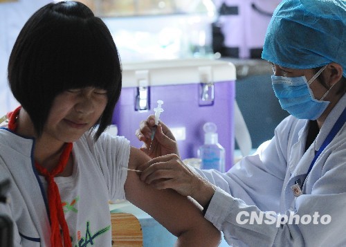 图为北京市朝阳区垂杨柳中学初一(2)班的学生正在接种甲型H1N1流感疫苗。中新社发 侯宇 摄