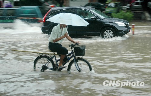 10月21日下午,海南三亚市民骑车经过三亚市大东海被雨水淹没的街道。受热带低压及冷空气的共同影响,自20日晚间开始,三亚遭遇持续的强降雨,导致市区一些路段积水严重。 中新社发 尹海明 摄