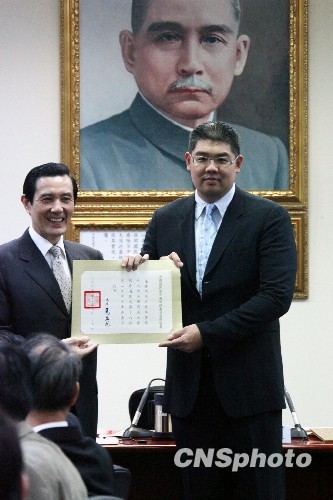 10月21日,中国国民党主席马英九在台北主持上任后的首次中常会,向党副主席和新一届中常委颁授当选证书。图为国民党荣誉主席连战之子、连任中常委连胜文获颁授当选证书。中新社发 黄少华 摄