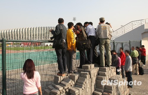 10月22日下午,“飞人”刘翔首次亮相济南奥体中心田径训练场,进行赛前训练,吸引大批记者前去“探班”,不少记者甚至为了拍到刘翔不惜“攀墙”。中新社发 汤彦俊 摄