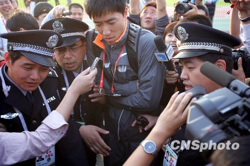 2009年10月22日下午,刘翔来到第十一届全运会奥体中心田径训练场适应场地,训练结束后,大批媒体将其团团围住。 中新社发 刘震 摄
