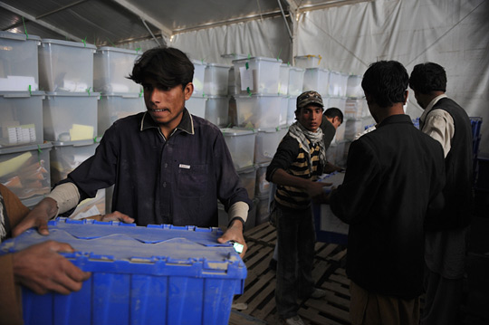 阿富汗独立选举委员会近日宣布,由于8月20日举行的总统选举没有候选人得票过半,阿富汗因此将于11月7日举行第二轮投票。图为10月22日,工作人员在阿富汗首都喀布尔运装投票箱。