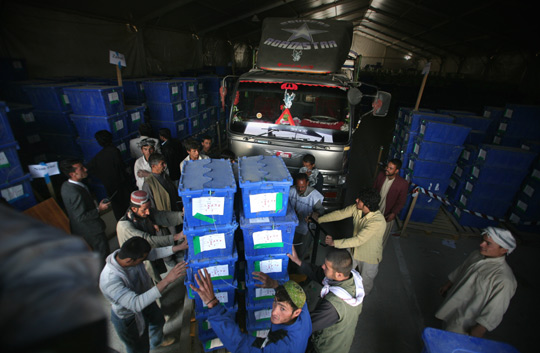 工作人员在阿富汗首都喀布尔往卡车上装选举投票资料。