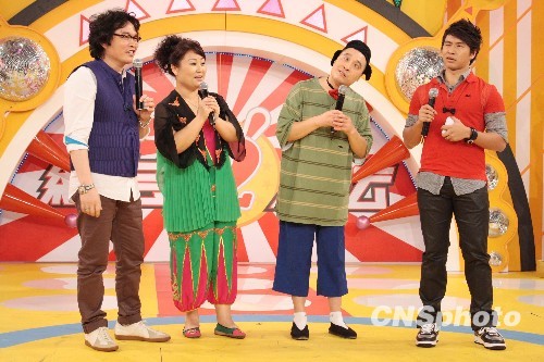 图为张小飞、贺美玲与主持人欧弟一起搞怪。中新社发 本山传媒 摄
